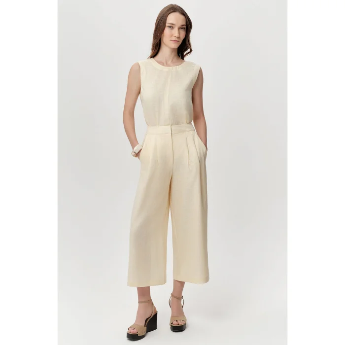Pocket Zippered Culotte Regular Linen Butter Trousers are a stylish and useful piece that combines your modern style with comfort. These culotte pants will add a nice touch to your wardrobe with their "butter" color, making them a versatile option that can adapt to many different occasions. Its wide-leg cut and elegant drape allow you to move comfortably all day long and offer a stylish look. It is designed to complement your style both in daily use and in more special moments. This women's trouser model highlights the natural texture and breathable structure of linen. Linen fabric, which keeps you cool and comfortable, especially in hot weather, is one of the reasons why these trousers are preferred. The zippered pocket allows you to carry your small items with confidence, adding functionality to the overall design of the pants. Its regular fit fit and ankle-length cropped length create an up-to-date and modern silhouette. Pocket Zippered Culotte Regular Linen Butter Trousers offer versatile combination possibilities. Thanks to its simple design, it can be easily combined with basic t-shirts, stylish blouses or elegant shirts. With the choice of accessories, it can take on a sporty look or a more classic style. Whether it's a stroll around town, a lunch, or a more formal occasion, these pants provide you with a stylish presence. With these wide-leg trousers, you can enjoy being both comfortable and stylish. For those who embrace a minimalist and modern fashion approach, these trousers are a stylish and functional choice. Its ability to easily match with different tops and shoes will make it one of the key pieces in your wardrobe. It is a suitable option for those who are looking for linen trousers and want to experience comfort without sacrificing elegance. You can add an elegant atmosphere to your combinations with these modern trousers. Product Details: - Fabric: Linen - Color: Light Beige - Cut: Regular Fit, Culotte (Wide Leg, Ankle Top) - Features: Zippered Pocket