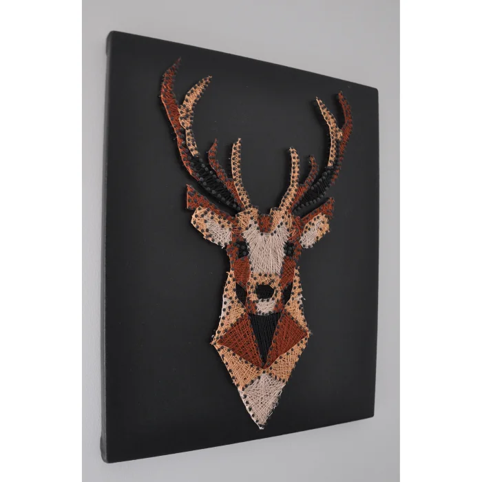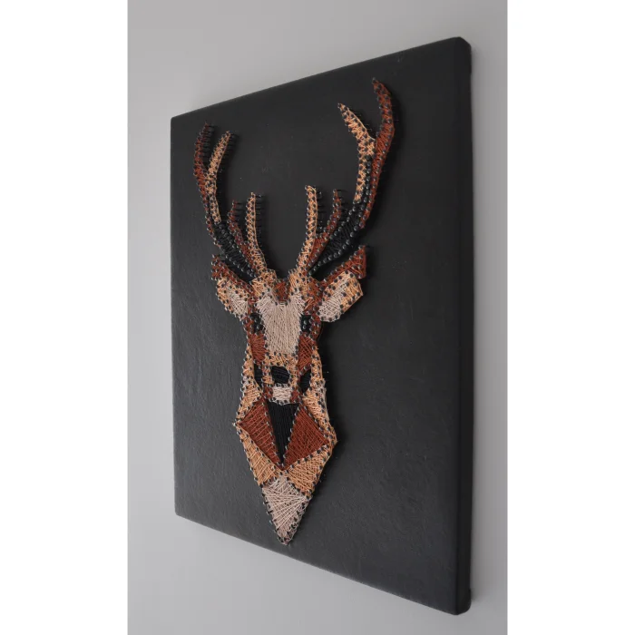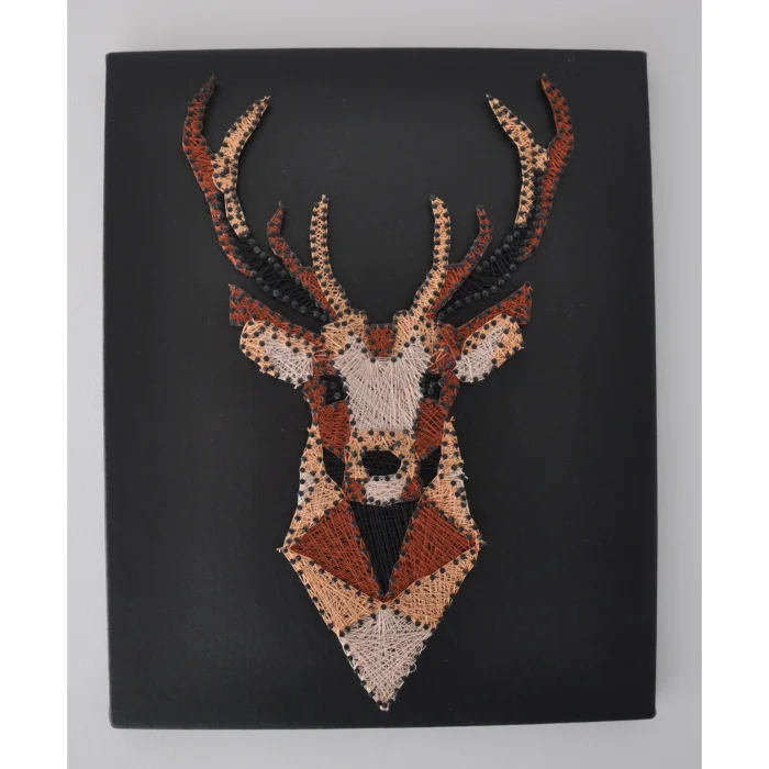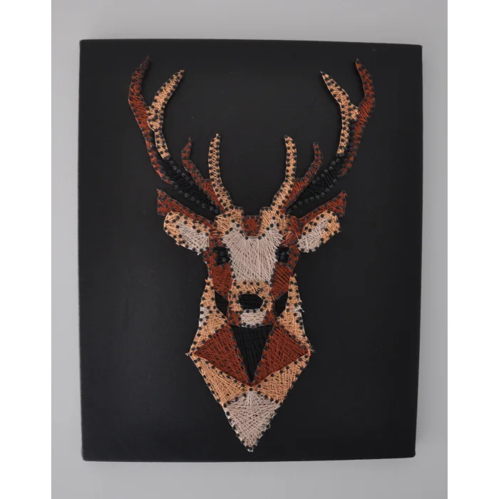It is a figurative work embroidered with nails and colored threads on a black leather background. Cubic deer motif was created using natural colors.