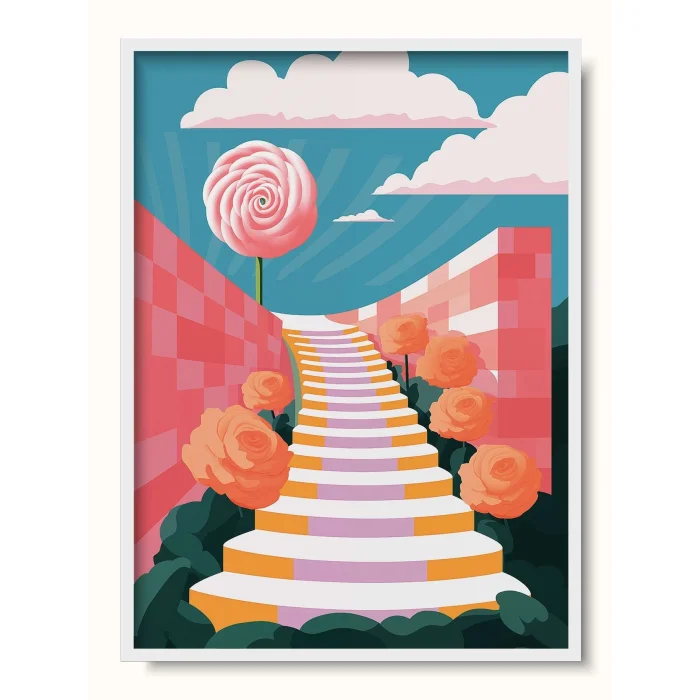 A grand staircase led towards a giant rose in the sky, surrounded by checkerboard patterns.