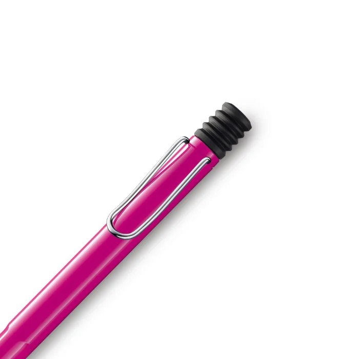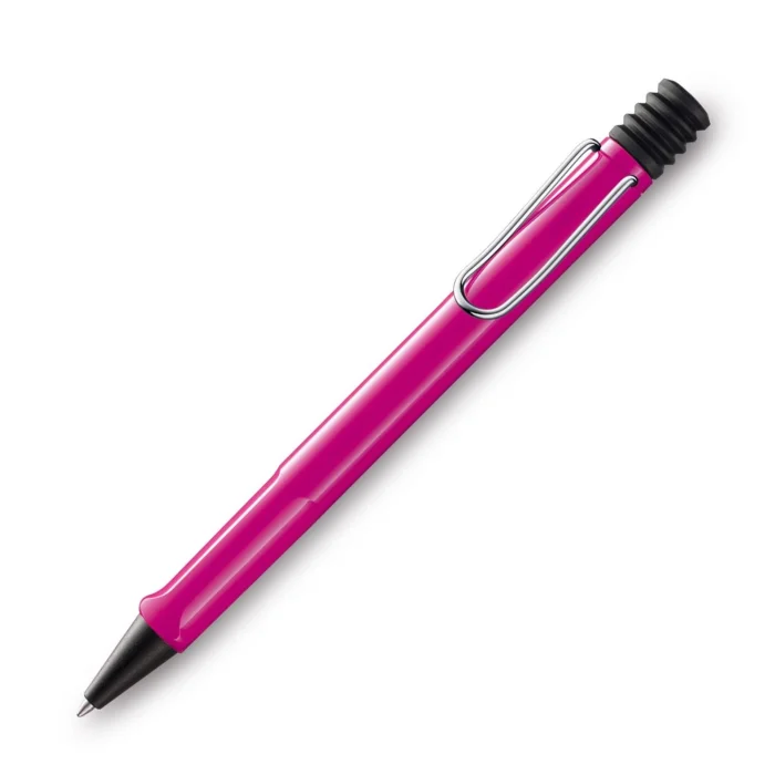 LAMY Safari series bright pink ballpoint pen. Durable plastic housing Flexible Unique Metal Clip Ergonomic Grip The LAMY M16 has a black reflux. Designer: Wolfgang Fabian International Design Award: IF Made in: Germany