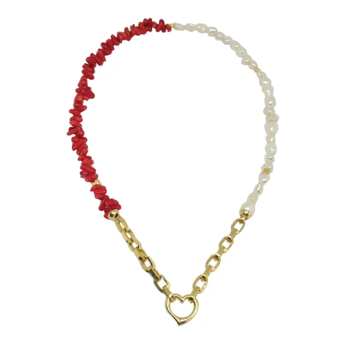 Red Coral & Small-size Asymmetrical Almond-shape Pearl Necklace with “925 sterling silver” Chain