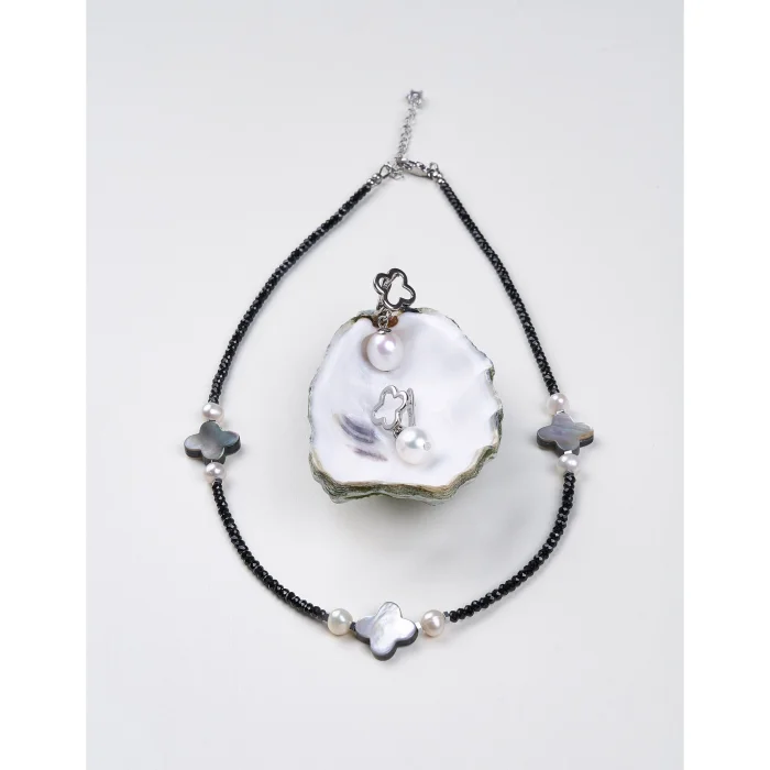 On a slender silver chain hangs a quartet of mother-of-pearl clover charms, each floating above smooth black quartz beads and freshwater pearls. The luminous white petals contrast dramatically with the deep onyx tones—wisdom and whimsy in carefully balanced form. It's a piece that feels lucky, timeless, and slightly rebellious.