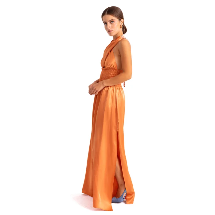 •Smocked waist, criss cross halter neck dress. •Maxi dress can be tied to neck or buttoned to back with crossing the straps. •Silky soft vegan fabric.