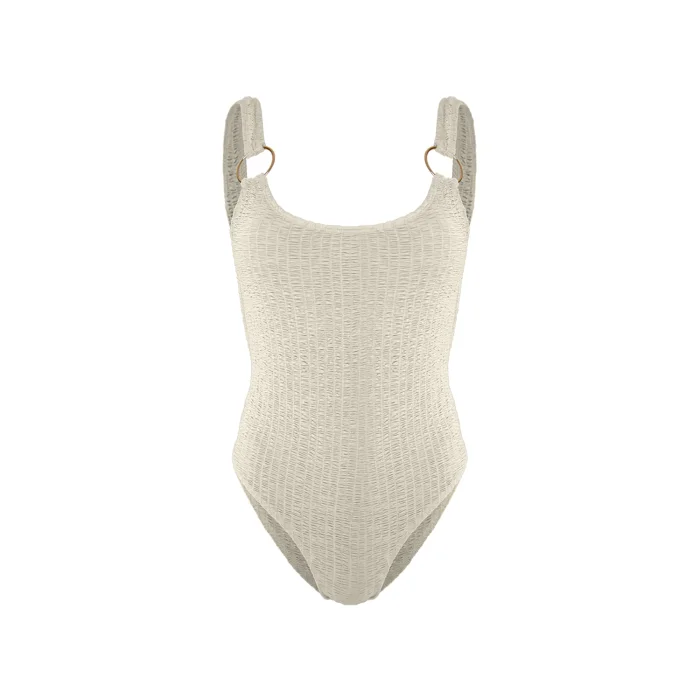 •Large gold rings connects straps with top, forming a vintage style. •Flattering smocked fabric fits perfect. •Delicate low cut back & medium cut legs. •Smooth stretch lining for extra comfort. •Removable push up paddings.