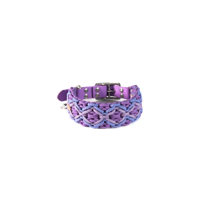 Diamond Lavender is handmade with high quality Paracord 550 (parachute rope) in lilac and lavender tones. Complemented by an amethyst vegan leather detail, the design combines elegance and durability in a balanced way. It is especially ideal for large breed dogs. It is comfortable and practical because it is adjustable. All of our dog collar and walking straps use water-resistant materials. It is suitable for sea and pool use.