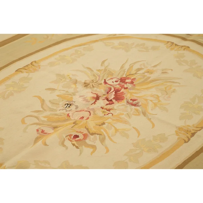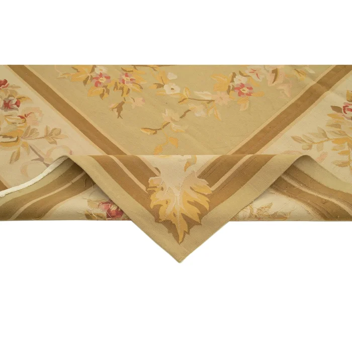 The Aubusson Rug is 272 cm wide by 366 cm long and about 5 mm thick. It weighs an average of 11 kg. It is made with hand-spun wool and cotton. It takes its colors from root dyes obtained naturally.