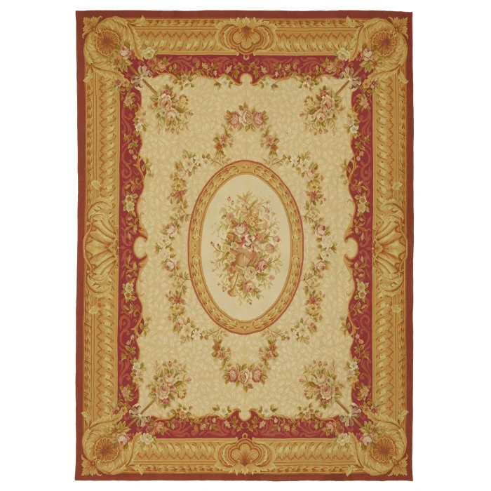The Aubusson Rug is 270 cm wide by 380 cm long and about 5 mm thick. It weighs an average of 11 kg. It is made with hand-spun wool and cotton. It takes its colors from root dyes obtained naturally.