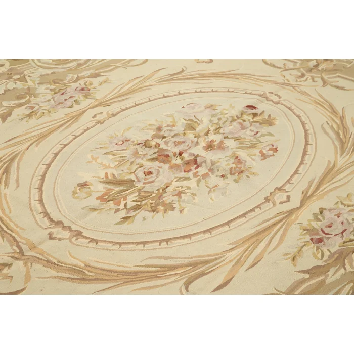 The Aubusson Rug is 270 cm wide by 367 cm long and about 5 mm thick. It weighs an average of 11 kg. It is made with hand-spun wool and cotton. It takes its colors from root dyes obtained naturally.