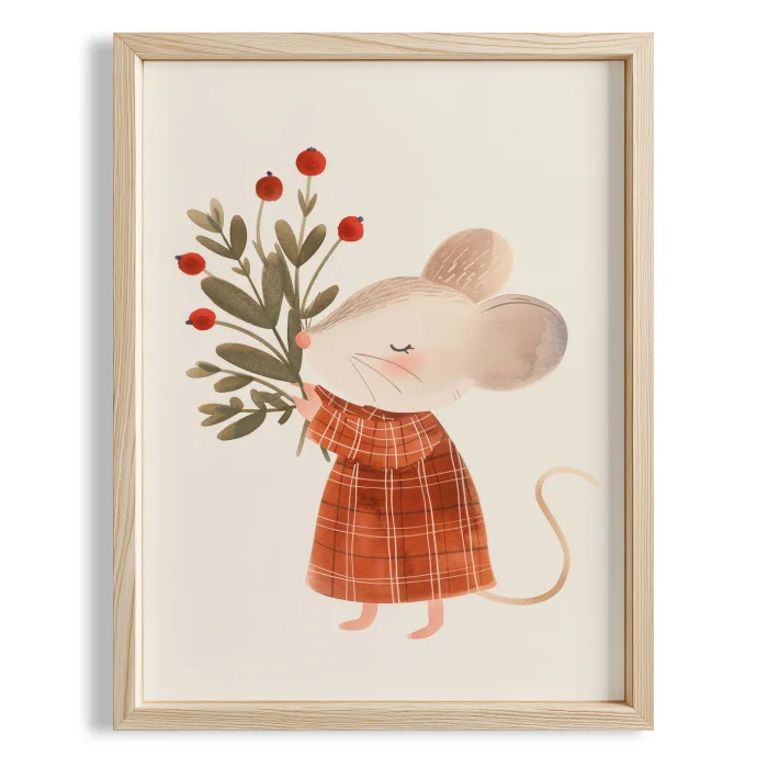 Product: Cute Mouse Carrying Flower Bunch Kids Room Wooden Wall Art