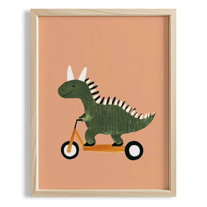 Product: Dinosaur Riding A Scooter -themed With Beige Background Kids' Room Wooden Wall Art