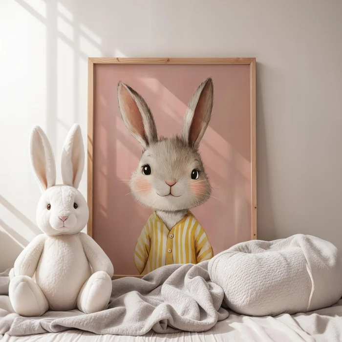 Product: In Pajamas Sleeper Sweet Rabbit - Pink Background Children's Room Wooden Framed Wall Art