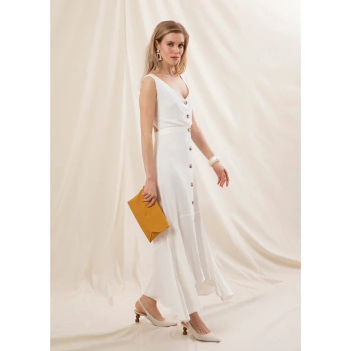 V shaped neck, back detailed, button down, flare dress, pops out of an envelope PU Leather C-ya Clutch