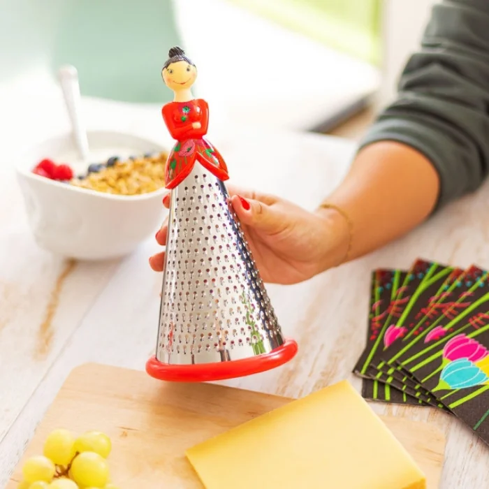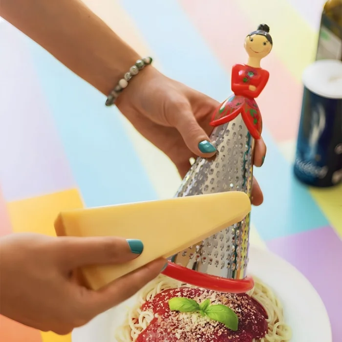 They call me "Ma Dame" and I am often praised for my stylish and elegant presence. Sometimes it's jokingly said that my long dress is a bit "stiff". But don't worry, I'm quite playful and self-indulgent; I love to slip off your shelf and come into your kitchen and subtly grate your cheese, chocolate, or citrus zest. Thanks to the three different hole sizes in my dress, you get a flawless grater that will enhance your meals. If you're looking for a smaller version, my little grandma Nonna is just as affectionate as I am. So don't hesitate to invite me to your kitchen; I would be delighted to accompany you on your culinary adventures and add both elegance and fun to your meals. Just remember to hand wash me to maintain the delicate structure of my dress. See you in delicious discoveries!