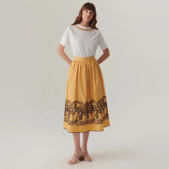 This white crew neck t-shirt, which creates a minimalist elegance with its elegant gold embroidery, offers comfort all day long with its 100% cotton texture. Thanks to its regular fit, a balanced stance is achieved in every body, and it fits perfectly with every bottom piece with its simple design without pockets. Whether combined with a stylish skirt or casual jeans; This t-shirt becomes your stylish daily choice.