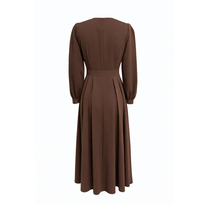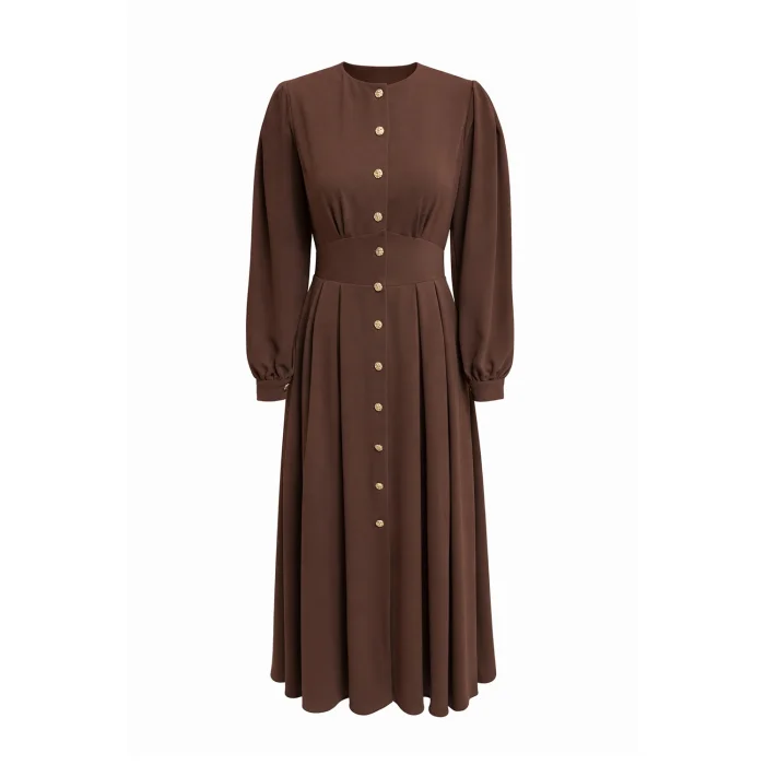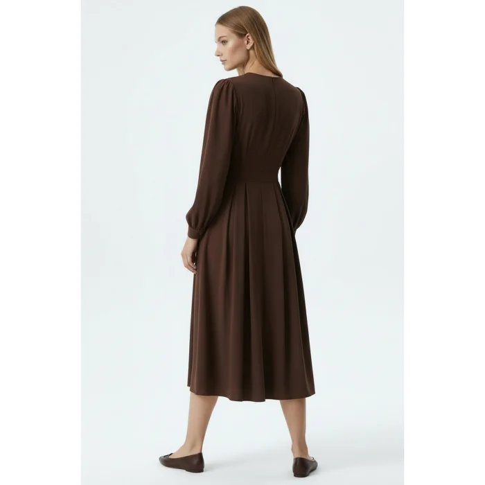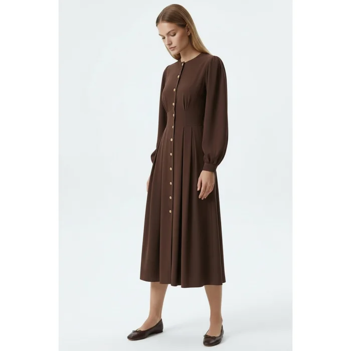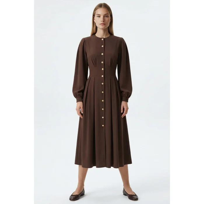 Standing out with its elegant and balanced silhouette, this midi length dress is among the indispensable pieces of the wardrobe with its timeless design. The button detail on the front gives the dress a stylish look, while its waist-fitting form and downward-opening pleats offer a feminine stance. The long sleeve structure and round neck cut create a simple but powerful style. Thanks to its flowing fabric, it provides comfort all day long. Offering a strong look on its own, this model can be easily combined with different shoes and accessories. Product Details Midi length Front button closure Waist fitting, pleated skirt form Long sleeve Round neckline Comfortable and flowing fit