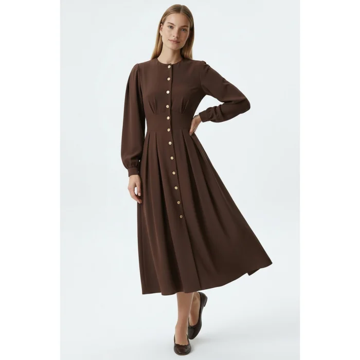 Standing out with its elegant and balanced silhouette, this midi length dress is among the indispensable pieces of the wardrobe with its timeless design. The button detail on the front gives the dress a stylish look, while its waist-fitting form and downward-opening pleats offer a feminine stance. The long sleeve structure and round neck cut create a simple but powerful style. Thanks to its flowing fabric, it provides comfort all day long. Offering a strong look on its own, this model can be easily combined with different shoes and accessories. Product Details Midi length Front button closure Waist fitting, pleated skirt form Long sleeve Round neckline Comfortable and flowing fit