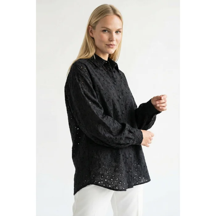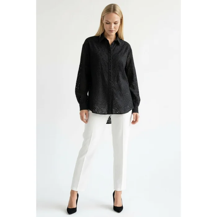 Combining the classic line of its long-sleeved design with the elegant texture of scallop details, this black shirt is a candidate to be an indispensable piece of every wardrobe. Thanks to its regular fit pattern, it offers both comfortable use and a stylish silhouette, adapting to every style from day to night.