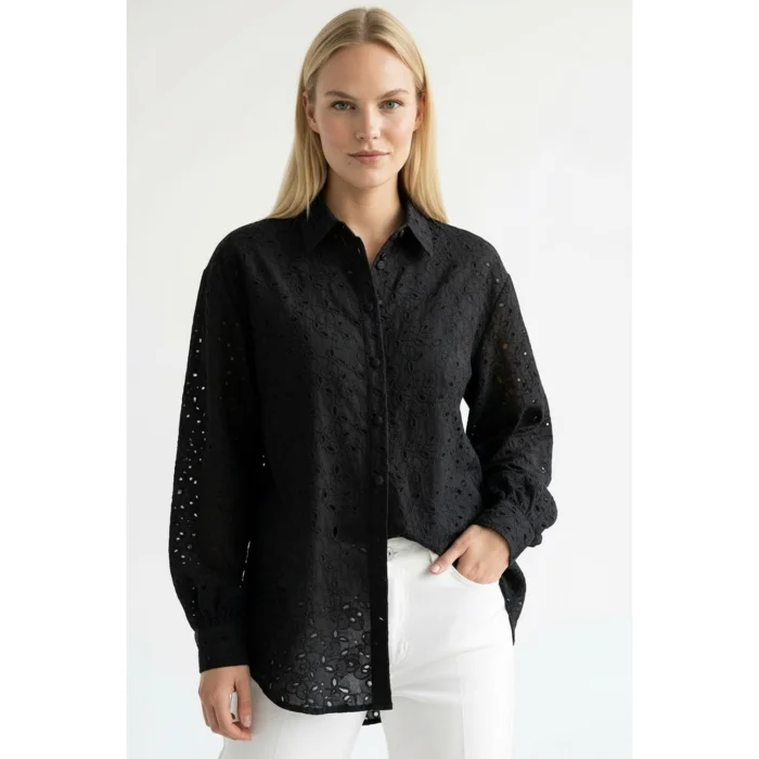 Combining the classic line of its long-sleeved design with the elegant texture of scallop details, this black shirt is a candidate to be an indispensable piece of every wardrobe. Thanks to its regular fit pattern, it offers both comfortable use and a stylish silhouette, adapting to every style from day to night.