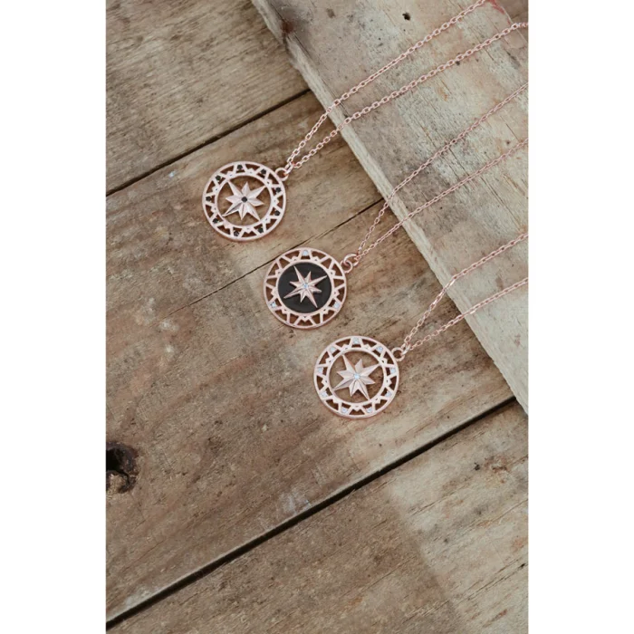 925 Sterling Silver - 14 carat rose gold-plating North & Polestar Medallion Necklage with white gem detail.