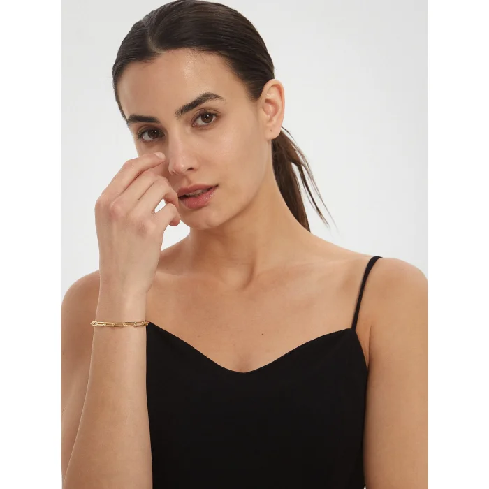 This Classic Paperclip Chain Bracelet boasts a delicate yet durable design featuring elongated links for a modern minimalist look. 5mm is a great width for an elegant but chic look. The high shine gold finish adds a touch of luxury, while the secure lobster clasp with subtle charm detail ensures a secure fit. Versatile and timeless, this bracelet is a must-have addition to any jewelry collection. Materials 18K gold plated on brass Measurements Length: 17cm/19cm Width: 5mm Weight: 5.3g