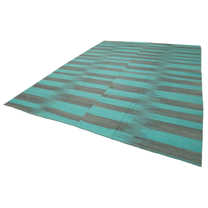 Modern Kilim Rug 297 cm width and 402 cm length and the pile height is 5mm, the approximate weight of the rug is 20 kg. It’s % 100 hand knotted wool and goat hair rug. It’s made from the natural dye.