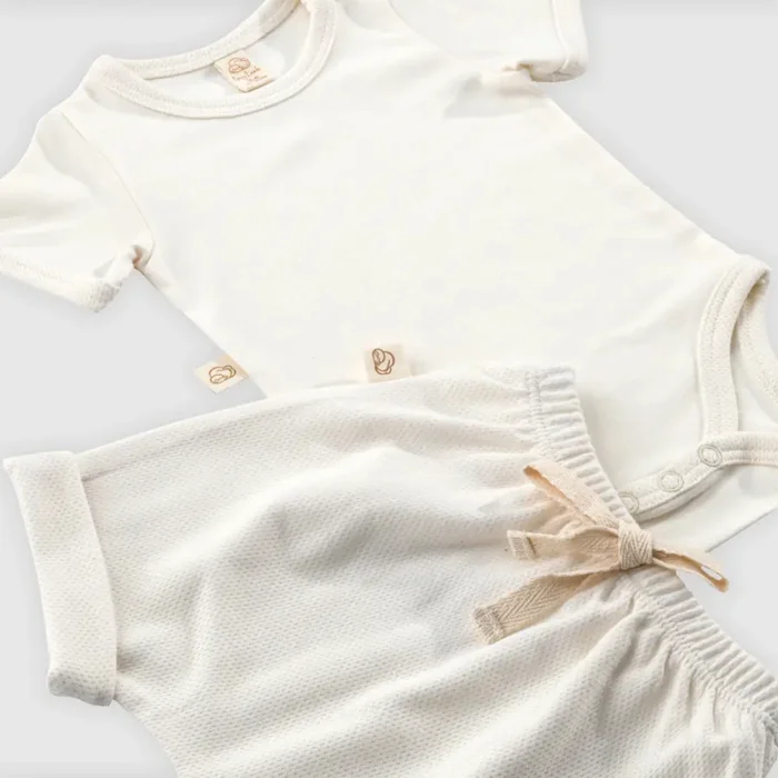 The bodysuit set with Tiny Lamb Elation Milk shorts is an ideal option for your baby to look comfortable and stylish in the summer. This 2-piece summer baby outfit set is made from 100% organic cotton and is friendly to your baby's sensitive skin. The combination of short-sleeved bodysuits and shorts will keep your baby cool and comfortable in hot weather.