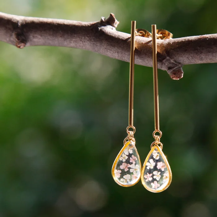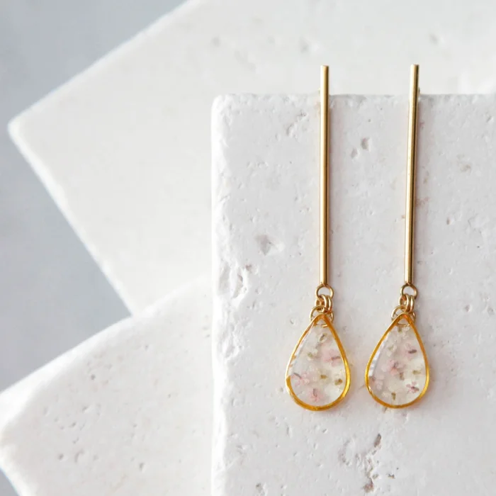 Stainless steel & resin earrings with dried real queen anne's lace flowers inside.12 mm x 55 mm