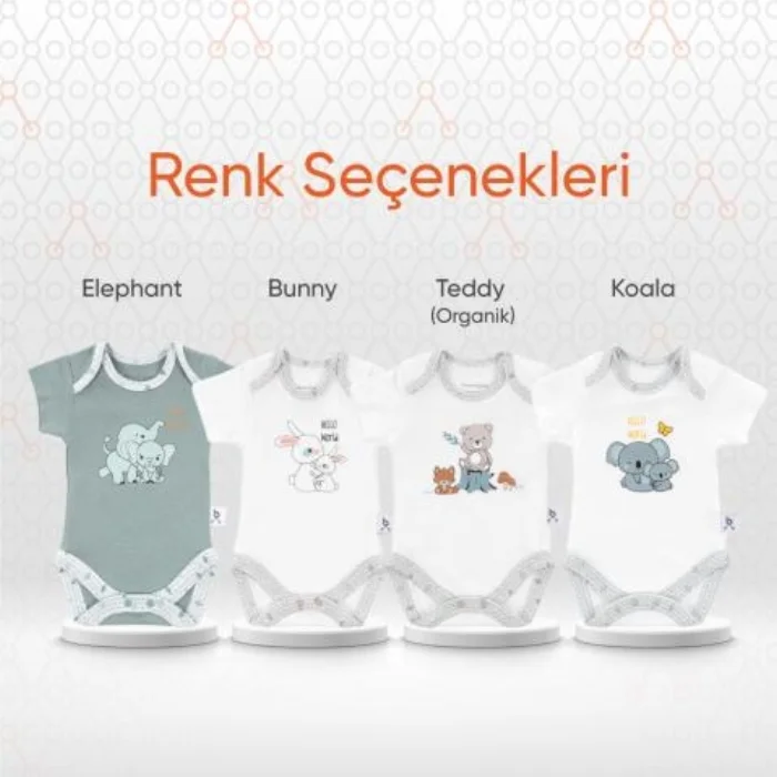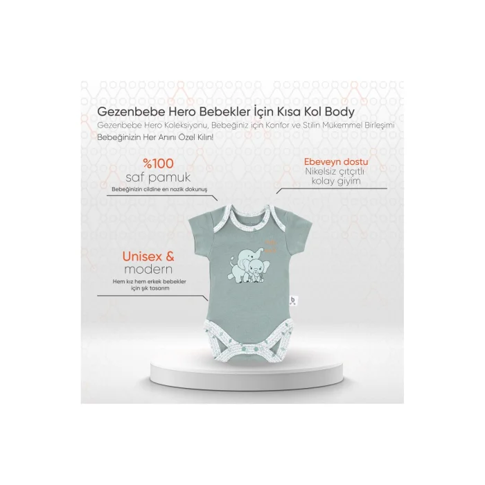 Product Description:Gezenbebe Hero Short Sleeve Body for Babies: Carefully Prepared for Your Baby's Delicate Skin - With Gezenbebe's Signature Pattern and Beloved Mascots! The perfect choice for your baby's sensitive skin: Featuring iconic patterns from Gezenbebe and mascots of Elephant, Koala, Teddy Bear and Rabbit, this bodysuit completes your baby's clothing collection. Highlights:GEZENBEBE'S UNIQUE DESIGN: Not just a baby bodysuit, but a style statement with Gezenbebe's original and exclusive patterns. PURE COTTON COMFORT: Made of 100% breathable cotton, the Hero Short Sleeve Body offers the softest touch to your baby's skin.SIGNATURE PATTERN & BELOVED MASCOTS: This bodysuit makes a difference in your baby's wardrobe with Gezenbebe's unique design, as well as its beloved mascots Elephant, Koala, Teddy Bear and Rabbit. UNISEX AND MODERN: It is designed for both girls and boys and draws attention with its fashionable patterns. USER-FRIENDLY: Offers easy wearing and replacement with its nickel-free snap design. PERFECTION IN EVERY DETAIL FOR YOU: We care about customer feedback and are constantly improving our products to make them perfect with comfort, fit and quality. Technical Details:Size Options: Newborn, 0-3 months, 3-6 months, 6-9 months, 9-12 months, 12-18 months. Color Options: Bunny, Elephant, Koala, Teddy (Organic)Please carefully review the size and color options before ordering. The Gezenbebe Hero collection is not just an outfit for your baby, but also the perfect combination of comfort and style. Make every moment of your baby's life!