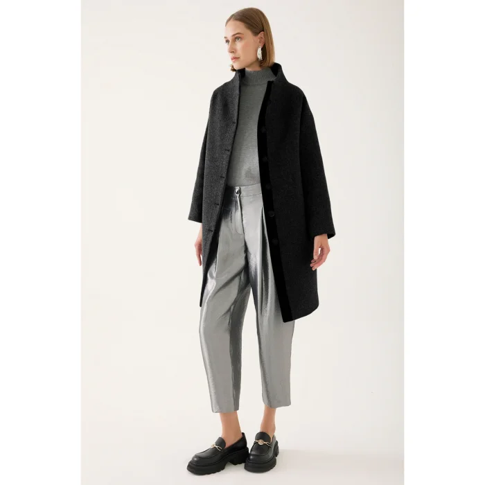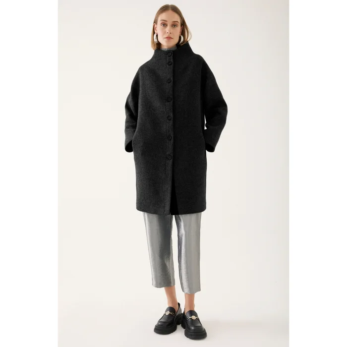 Adapting to every body type with its standard fit design, the Cronus black coat offers comfortable use; Thanks to its woven fabric structure, it combines durability and comfort; The material component, consisting of a mixture of 50% polyester, 30% wool and 20% acrylic, provides a stylish look while keeping you warm in cold weather; With its regular length cut, it is an ideal option for both daily use and special occasions;