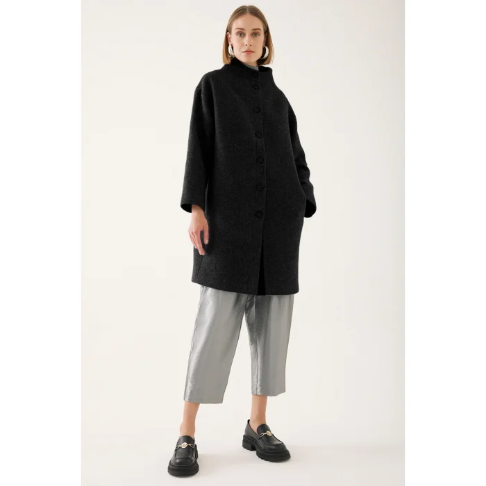 Adapting to every body type with its standard fit design, the Cronus black coat offers comfortable use; Thanks to its woven fabric structure, it combines durability and comfort; The material component, consisting of a mixture of 50% polyester, 30% wool and 20% acrylic, provides a stylish look while keeping you warm in cold weather; With its regular length cut, it is an ideal option for both daily use and special occasions;