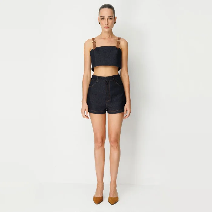 its short length highlights the legs, the suede belt detail and gold-plated buckle in the back pocket add a touch of sophistication to the shorts