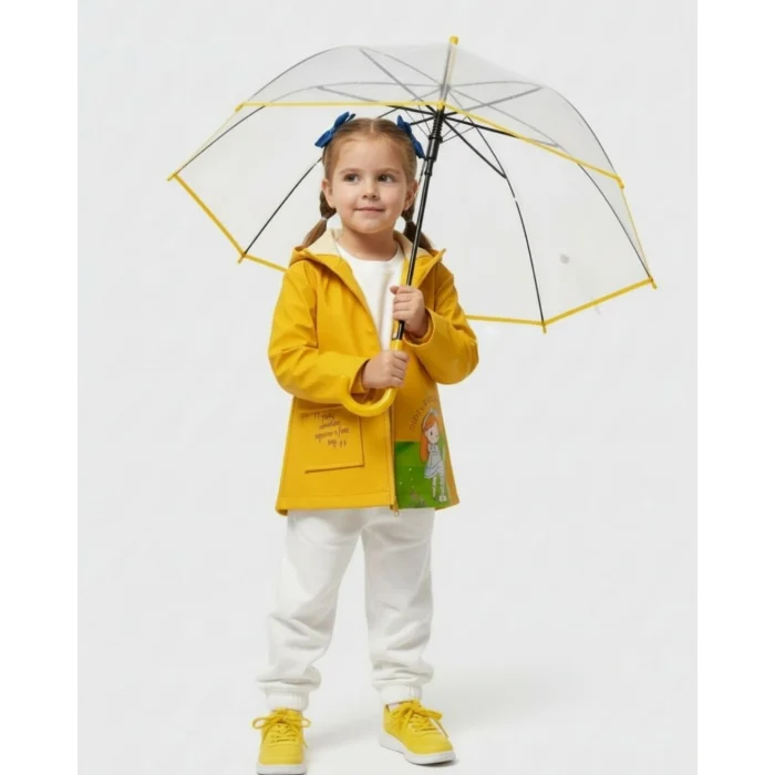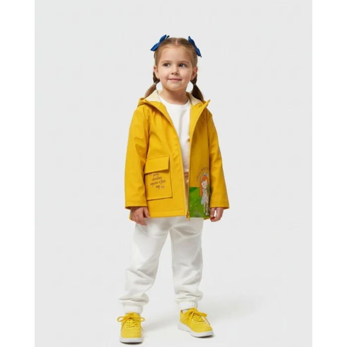 Raincoat made of waterproof fabric, hooded and long sleeves. Zippered front. The front pocket is welt and has print detail.