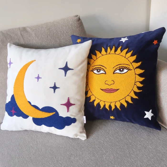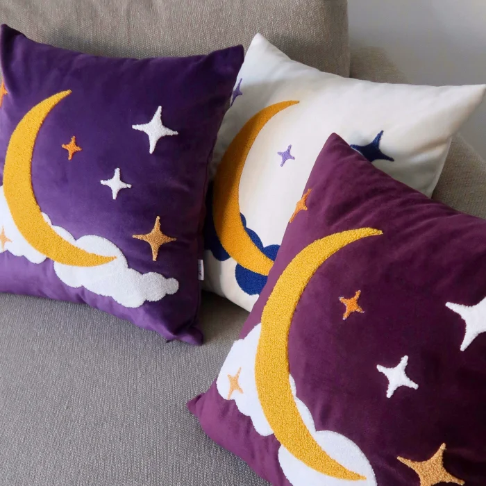 Colors: Melon, dark blue and violet embroidery on white velvet.