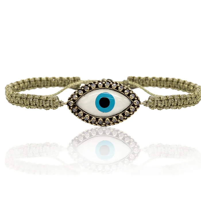 Production Type: Handmade Bracelet Material: Macramé thread, enamelled mother-of-pearl, 22-carat gold-plated bronze Length : Adjustable wristband for all wrist sizes Weight : 5 gr