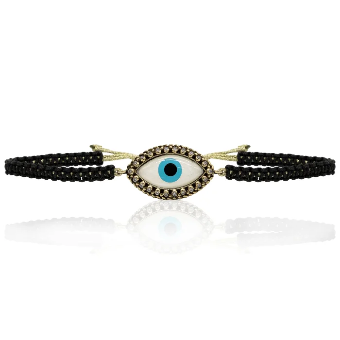Production Type: Handmade Bracelet Material: Macramé thread, enamelled mother-of-pearl, 22-carat gold-plated bronze Length : Adjustable wristband for all wrist sizes Weight : 5 gr