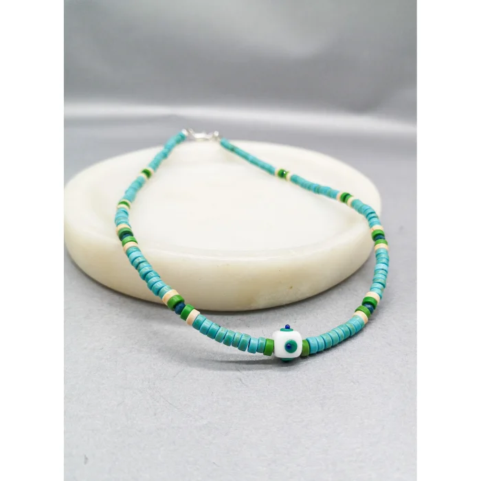 - Thanks to its glass material, it offers an elegant and stylish appearance; - With the use of natural stone, each piece adds a unique and authentic atmosphere; - The blue and green color combination creates an eye-catching aesthetic; - Murano evil eye bead detail adds a mystical touch to the necklace; It is designed with square-shaped beads and natural stones made by hand-shaping Murano glass.; It is 41 cm long.; It is produced by handcraft.