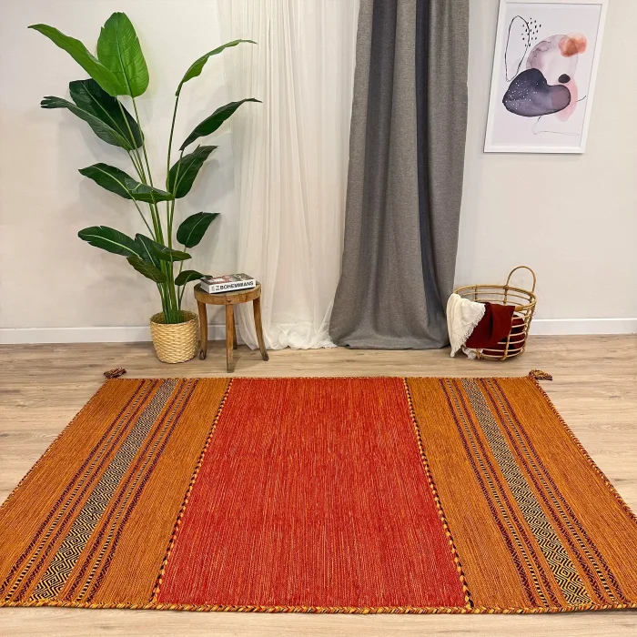 Produced with the hand-woven technique, this rug offers a modern and stylish look with its striped pattern Thanks to its cotton material, it glides comfortably under your feet with its soft texture and provides a comfortable walking experience with its moderate pile height