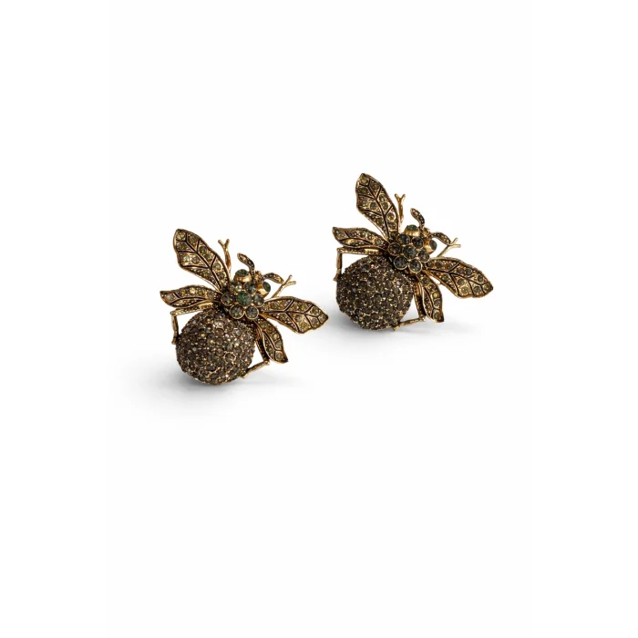 Bee-shaped designer earrings embroidered on bronze material and adorned with dark Swarovski stones. It offers a sophisticated and powerful style with its antique texture and deep tones.