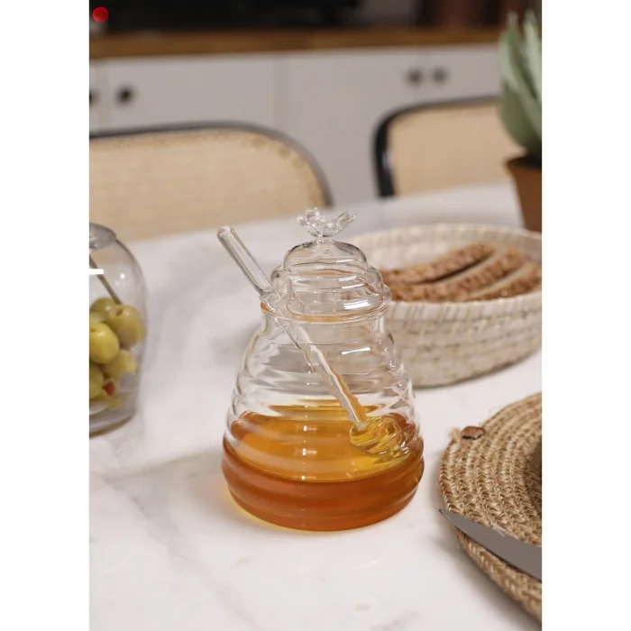 Glass Honey Jar The glass honey jar and honey spoon set was inspired by the Mayan beehive. With the glass honey storage jar and honey spoon set Yeast, you will be able to both preserve your honey and serve it easily on your table. Yeast honey is a specially designed product that will add privilege to your presentation. Our product is 100% handmade and produced by glass masters with blowing technique. It is made of special heat-resistant borosilicate glass. Product Dimensions: 13x10x10cmSuitable for washing in the dishwasher.