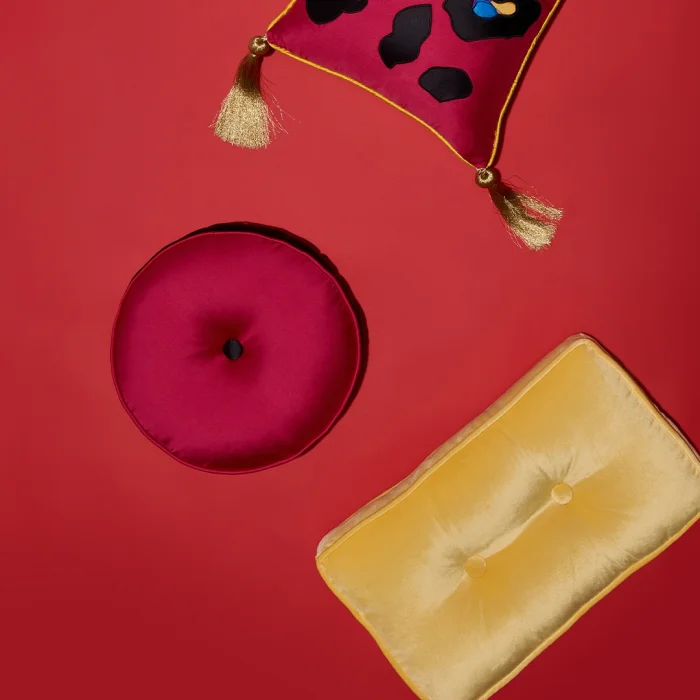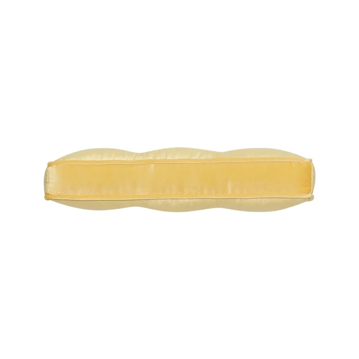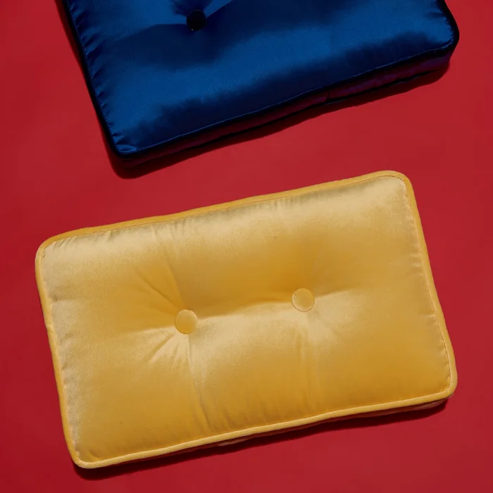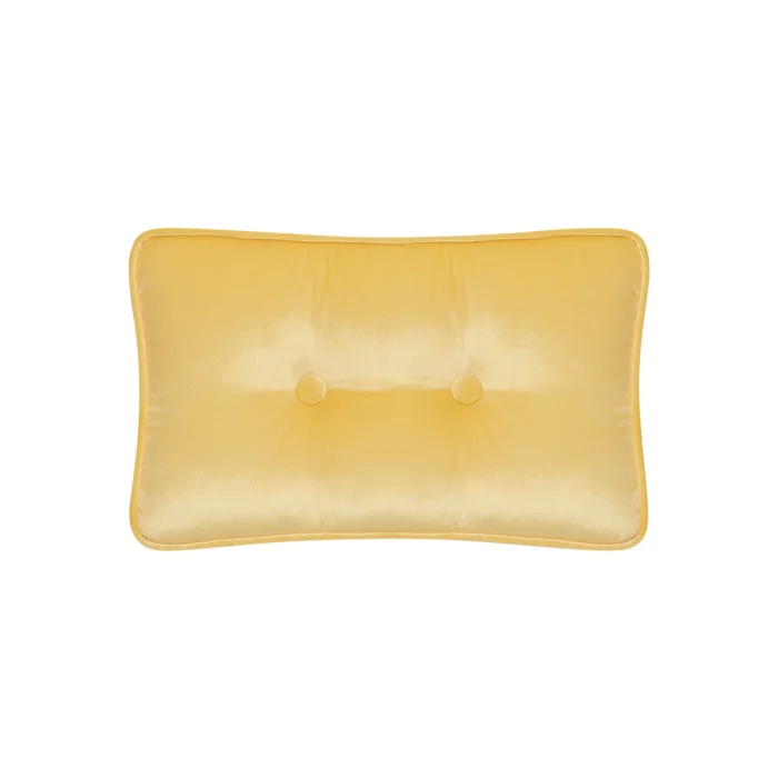 There are button details on the front and back of the yellow velvet pillow.
