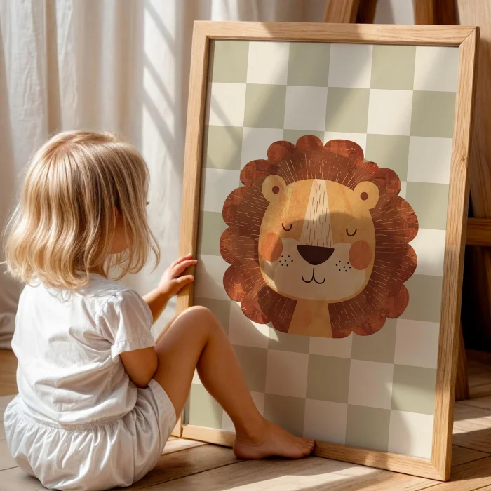 Product: Lion Cute Safari Animals With Green Checkered Background Kids' Room Wooden Wall Art