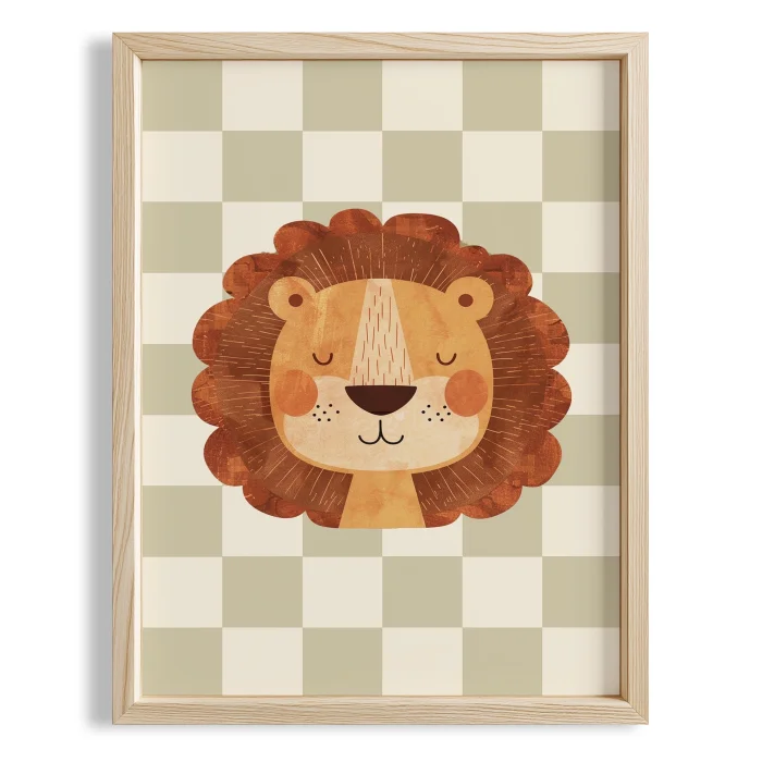 Product: Lion Cute Safari Animals With Green Checkered Background Kids' Room Wooden Wall Art
