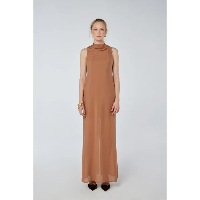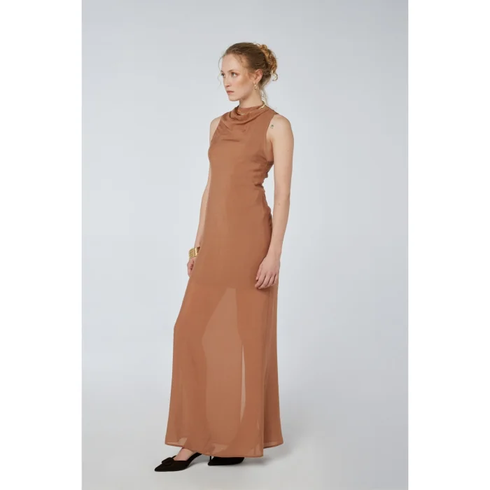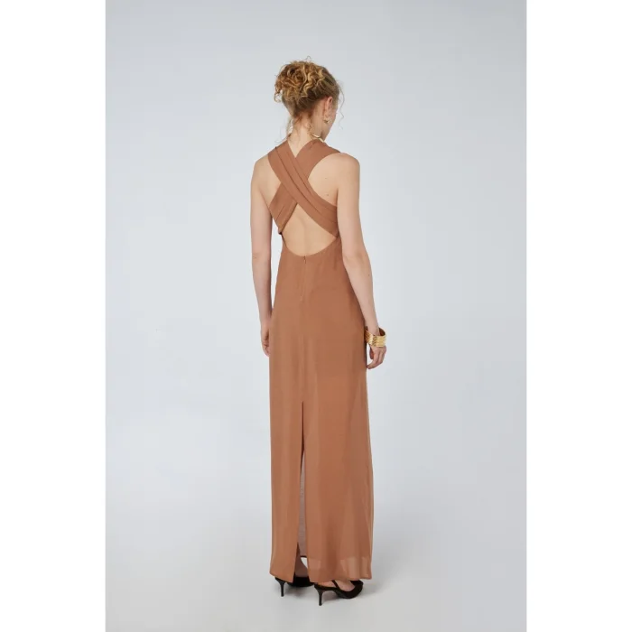 A sophisticated dress that blends sculptural draping with an open-back design, creating a striking yet effortless silhouette.