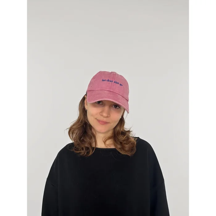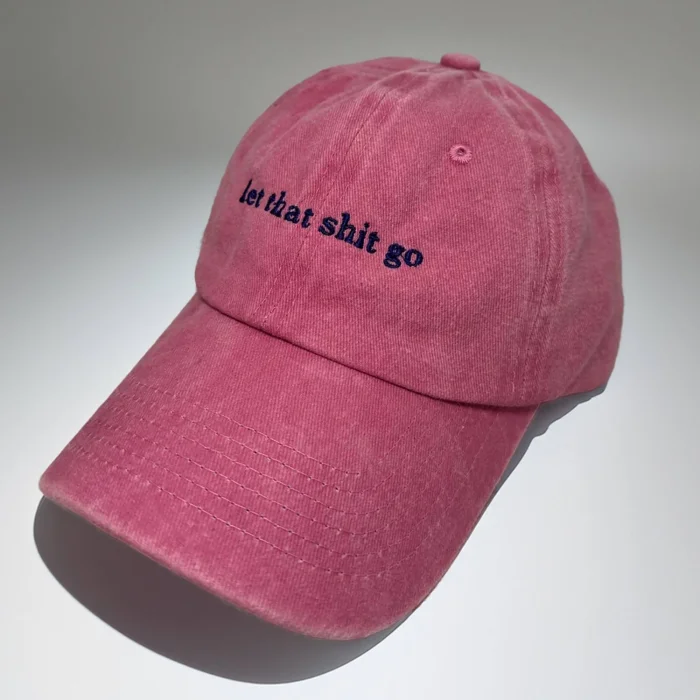 "let that shit go" embroidered cap. One size. Size can be adjusted with the clasp at the back. Made of cotton fabric.