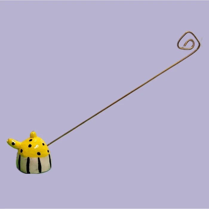 Ceramic, miniature teapot shaped, brass handle candle extinguisher.