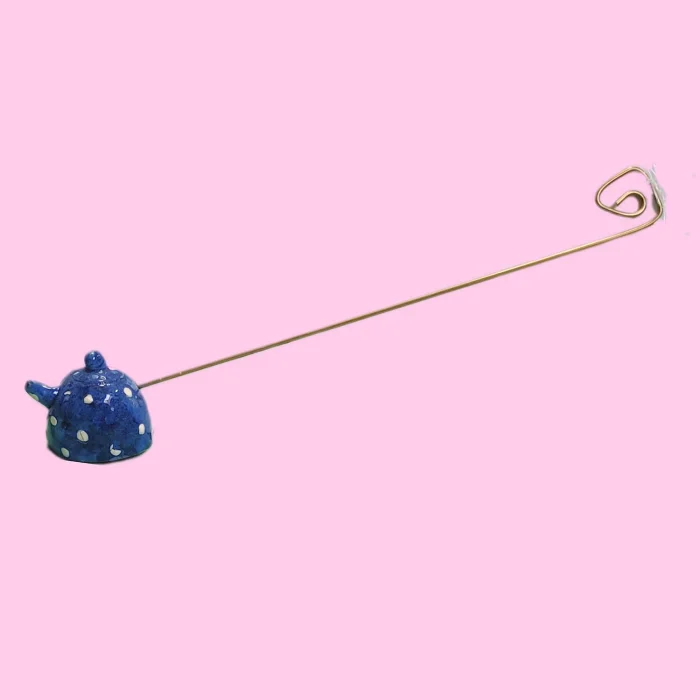 Ceramic, miniature teapot shaped, brass handle candle extinguisher.
