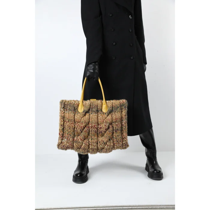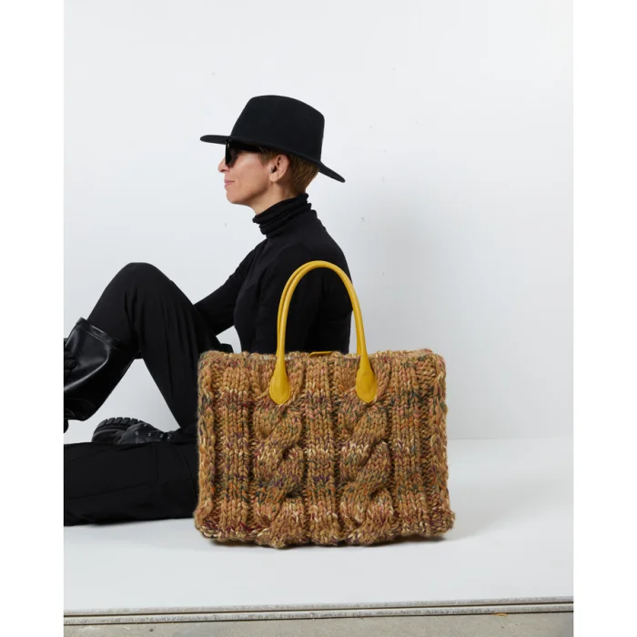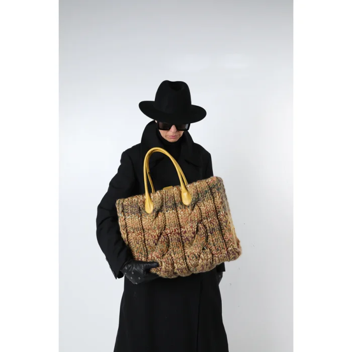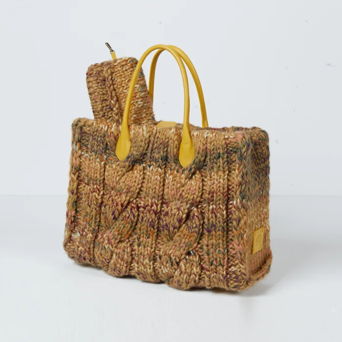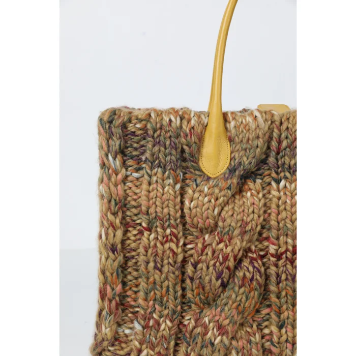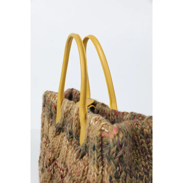 Handwoven using 100% wool yarn, produced using 100% calfskin leather.
