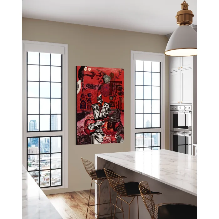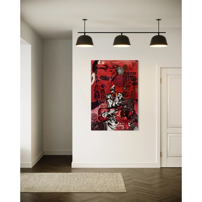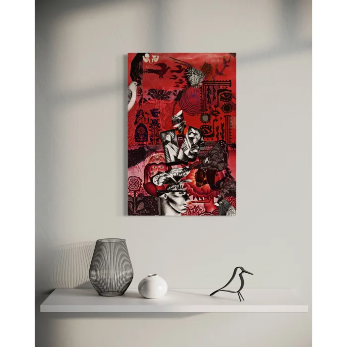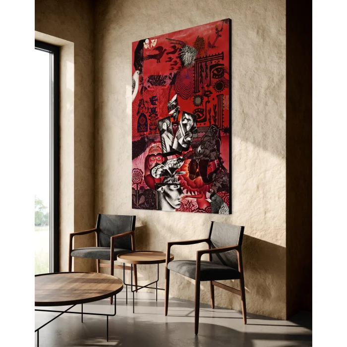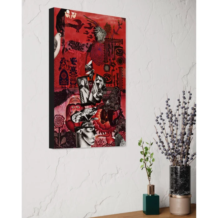 "This painting depicts a dream world in which a man with his eyes closed flies freely, accompanied by a mysterious woman who carries a yin-yang symbol. The man's wings, decorated with colorful bird feathers, sparkle as a symbol of freedom, while the yin-yang symbol burning in the woman's hands represents balance and harmony. In the background, an endless sea and sky create a timeless atmosphere. The woman's eyes bear the marks of her search for inner balance, while the man's face reflects the expression of his peaceful dream journey. While this painting tells a story that pushes the boundaries of imagination, it also presents a story of inner balance and search. It invites the viewer to join the journey of finding balance in their inner world. It is waiting for you to explore this magical world in your own living space." - "This painting reflects a dream world where a man with closed eyes soars freely, accompanied by a mysterious woman holding a yin-yang symbol. The man's wings, adorned with vibrant bird feathers, shimmer as a symbol of freedom, while the yin-yang symbol ablaze in the woman's hands represents balance and harmony. In the background, an infinite sea and sky create a timeless atmosphere. The woman's eyes bear traces of her quest for inner balance, while the man's face reflects the expression of a peaceful dream journey. This painting tells a captivating story that pushes the boundaries of imagination, while also presenting a narrative of inner balance and search. It invites the viewer to embark on a journey of finding balance within their own inner world. It awaits you to explore this enchanting world within your own living space."
