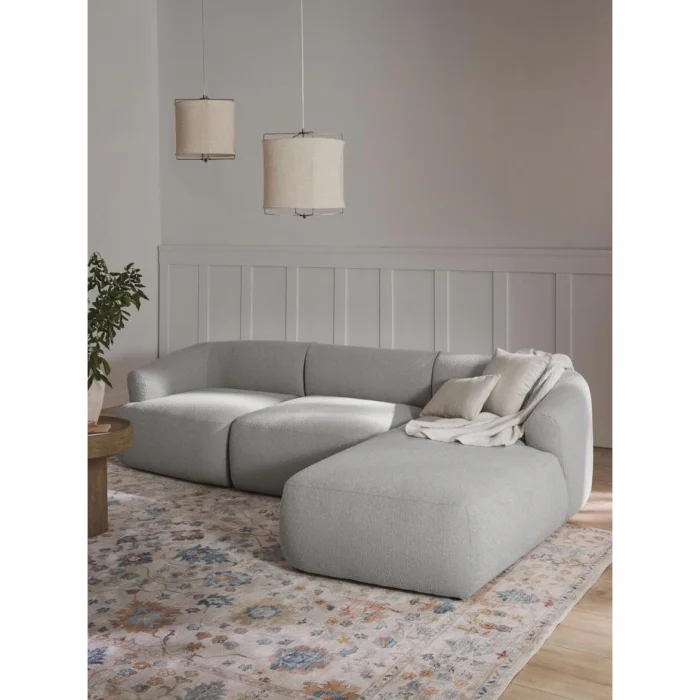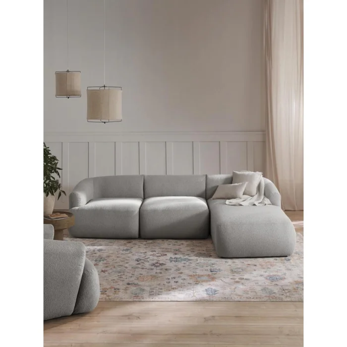 Leg height is 2.5 cm, and the maximum weight capacity per module is 150 kg. Material Fabric content: 70% polyester, 30% cotton. The fabrics were tested with 35,000 friction cycles in the Martindale test to make them more durable and long-lasting. Bouclé is a material characterized by its irregular curved structure. The characteristic surface is formed by woven loops made of different threads, which give the fabric a unique structure. The loop structure has an insulating and fluffy effect at the same time, which makes the fabric extra cute. The materials used in this product have been tested for harmful substances and are certified according to OEKO-TEX® SH015183646, TESTEX according to STANDARD 100. Upholstery: Foam padding + down sponge padding. Density: 35 DNS soft Frame: Baked hornbeam wood and MDF Feet: Plastic This product is made from wood from FSC-certified® sustainable sources. Tips The product is delivered fully assembled and can be used immediately after unpacking. The seat and back cushions are of medium firmness and at the same time offer a comfortable seating comfort. Upholstery filler is characterized by high elasticity, which allows the cushions to retain their shape. Light dirt can be easily removed with a damp cloth. Commercially available textile cleaning agents can be used for stubborn stains. Since we cannot provide a guarantee for cleaning agents, we have the following tip for you: Always test cleaning agents in an inconspicuous area! In this way, you can protect the fabric against possible wear. We recommend impregnating the fabric to ensure its longevity.