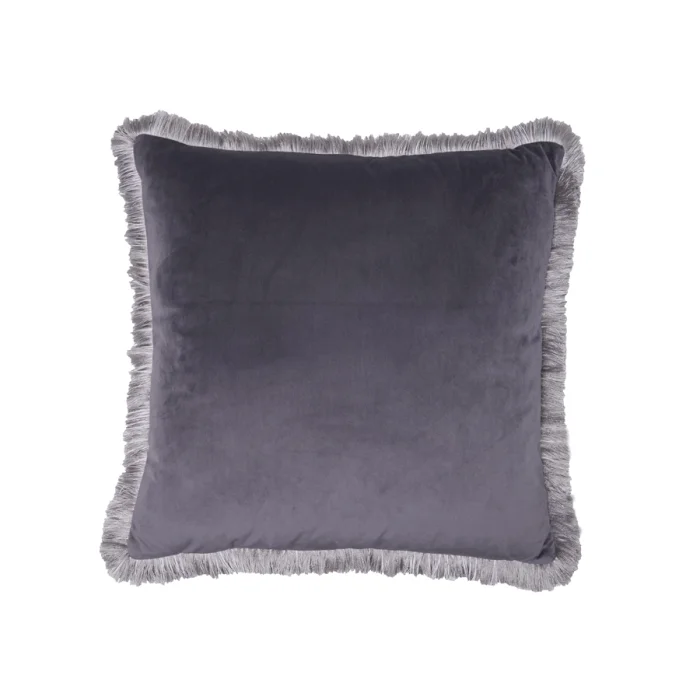 Gray Silky Plain Velvet. Tassel Fringe Detail on the Edge. The cushion features a hidden zipper. Decorative Cushion is shipped as filled (cushion insert included).